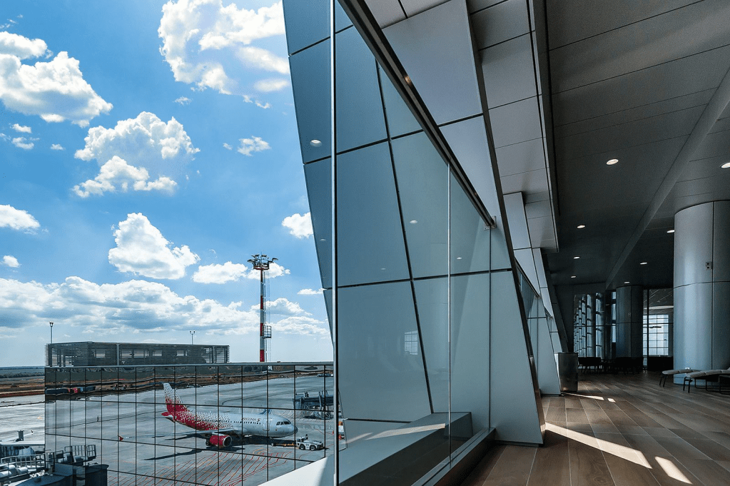 The shell is composed of rod and nodal elements, forming a triangular grid that covers the entire façade. The glazing panels are likewise triangular, which made it possible to use flat glass and avoid expensive curved units. They are made of aluminum profiles and attached to the shell from the outside. Each panel consists of thermally separated profiles with single chamber insulating glass units, providing high thermal insulation. In total, the terminal required about 9,000 glass panels. Depending on their position, height, and angle, various glass types were used, each with its own light transmission and transparency characteristics. Similar glazing technology was previously used at Sochi Airport.