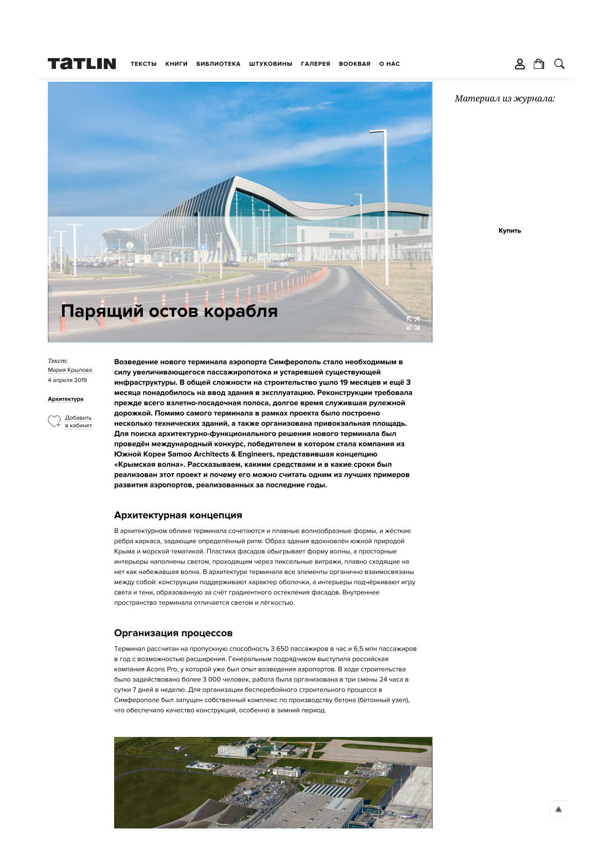 The construction of the new terminal at Simferopol airport became necessary due to increasing passenger traffic and the outdated state of existing infrastructure. In total, construction took nineteen months, with another three months required for commissioning the building. The runway, which had long served as a taxiway, was the first element in need of reconstruction. In addition to the terminal itself, the project included several technical facilities and the creation of a forecourt area. To determine the architectural and functional design of the new terminal, an international competition was held. The winner was the South Korean company Samoo Architects & Engineers, which presented the concept “Crimean Wave.”