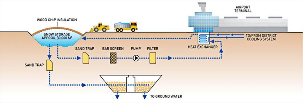 Fig. 11. Diagram of the water circulation system from the snow storage facility at Oslo Airport, Norway. Source: aviationbenefits.org