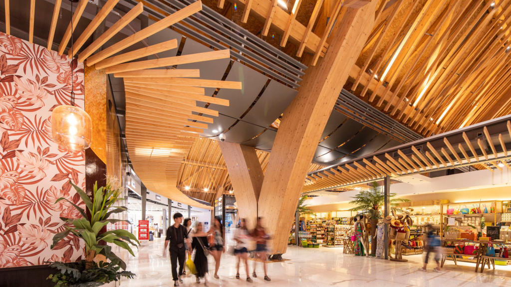 At San Francisco International Airport, the interiors of Terminals 2 and 3, both LEED Gold-certified, feature natural lighting, muted tones, and wood-textured finishes that create a calm, welcoming atmosphere.