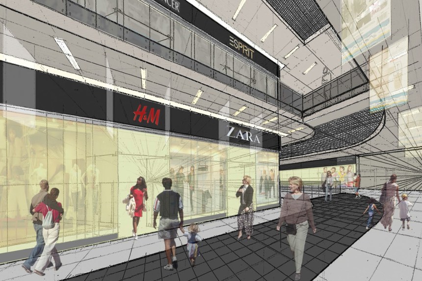 Concept of interiors for the shopping center built in 2013. The core part of an interior is central space supported with a ceiling light that goes along the floors from ground to the food court.